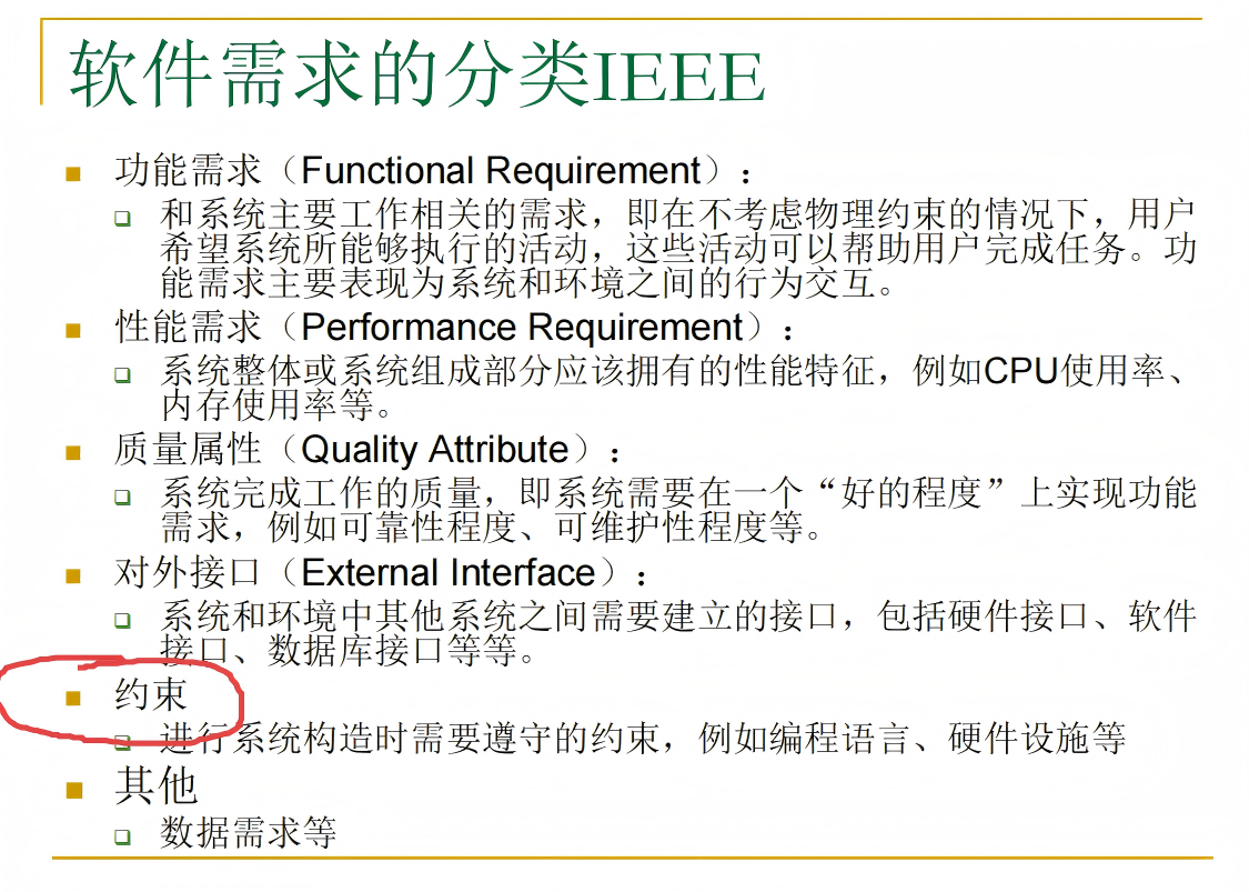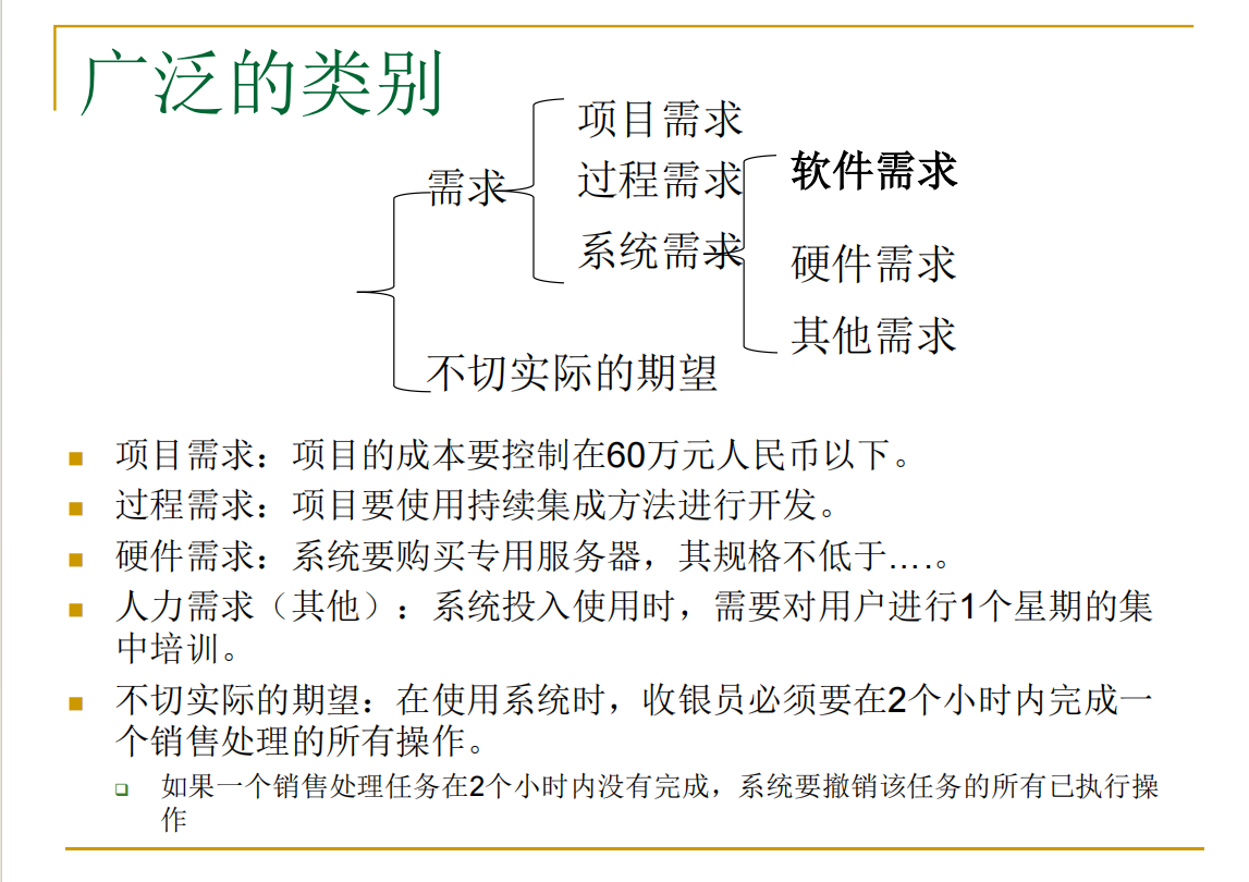 - 更广泛的分类:项目需求、过程需求、系统需求(软件需求、硬件需求、其他需求)