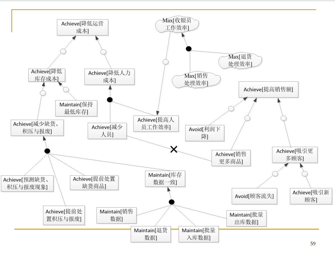 目标的关系:精化关系(AND精化、OR精化)、阻碍关系、支持与冲突关系。