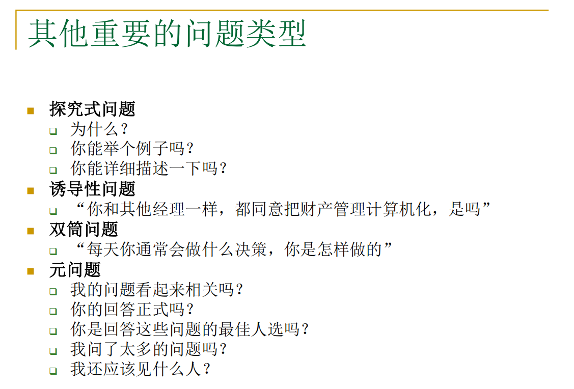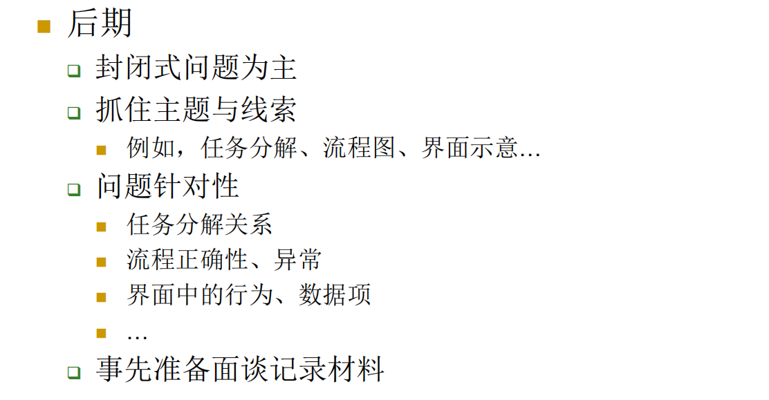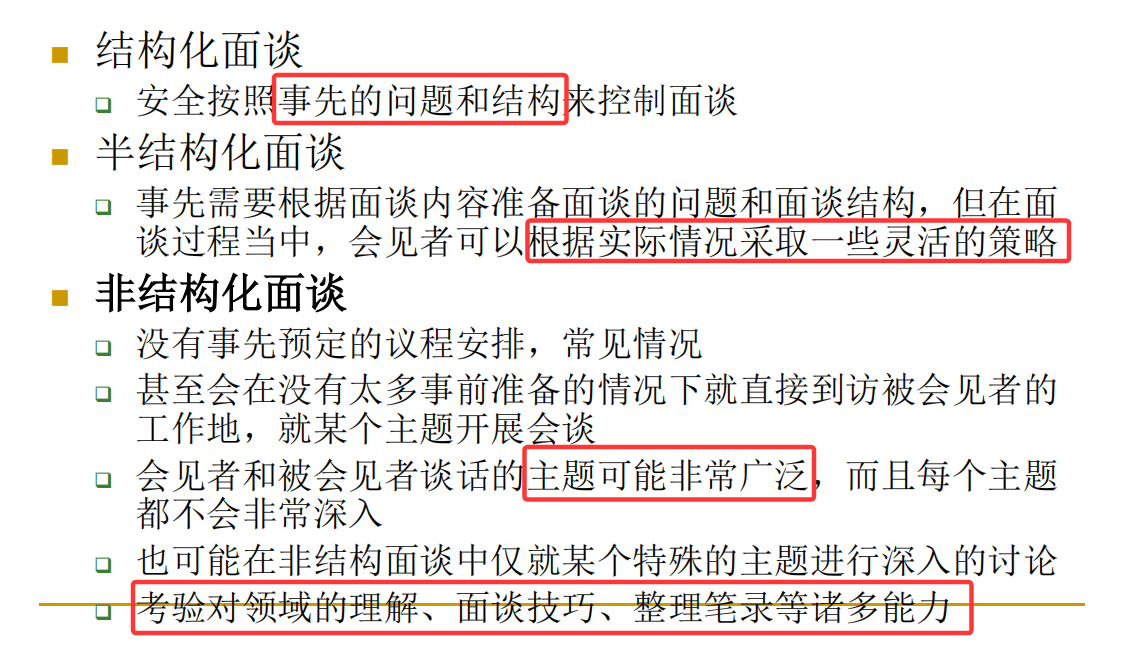 - 面谈与观察的互补: 面谈获取的是“应该是什么样的”(理想模型),而观察获取的是“现在是什么样的”(现实模型)。通过对比两者的差异,可以发现由于系统落后或流程不合理导致的潜在需求。