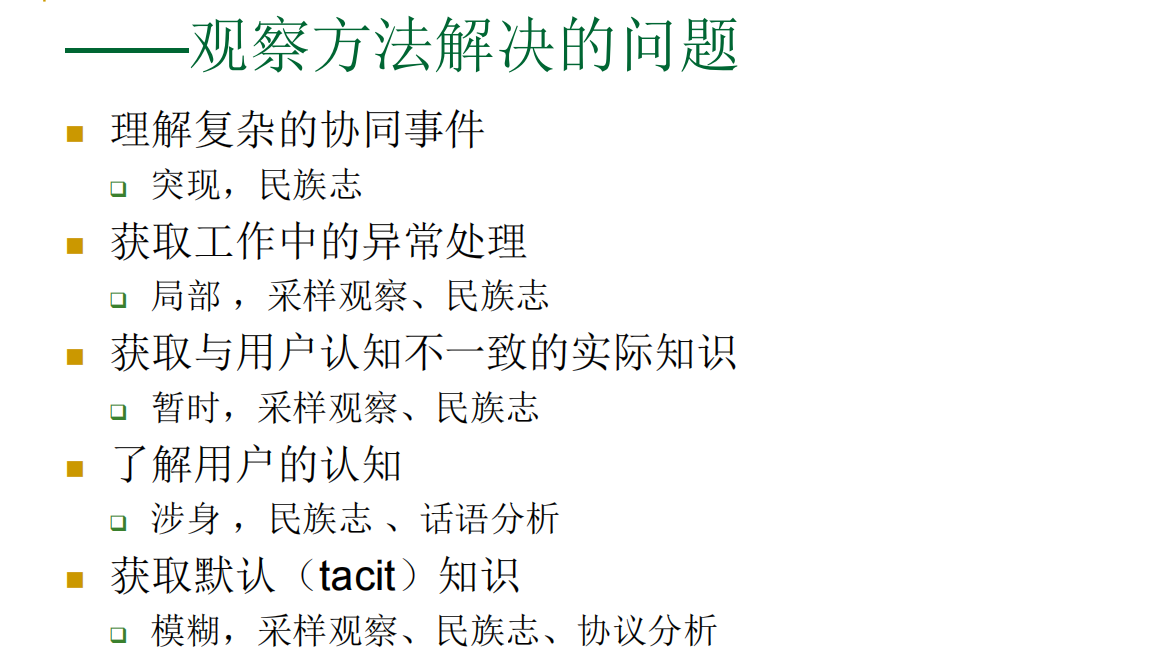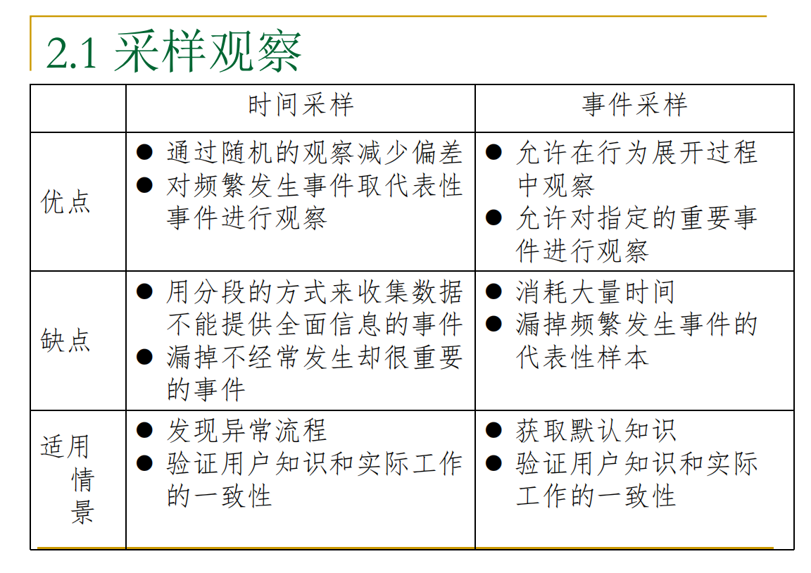 - 应用于用户无法完成主动的信息告知的情况下:采样观察、民族志、话语分析、协议分析、任务分析