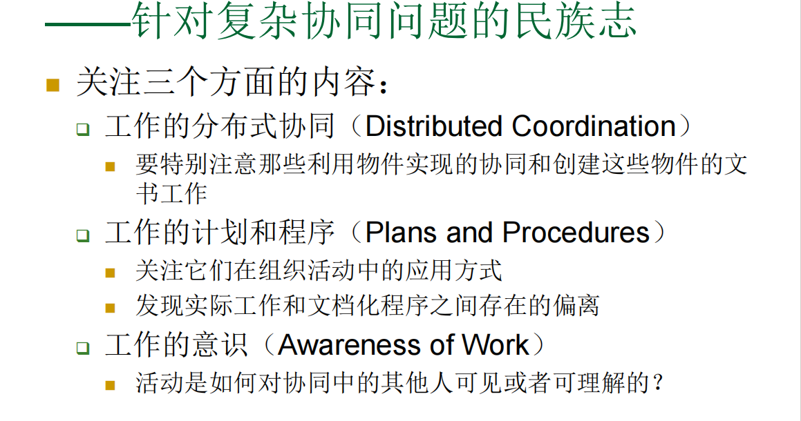 对于一些复杂的协同工作而言,工作的协同安排具有社会性,有突现的情景性,民族志可以帮助开发者了解这些工作的社会性因素,解决突现的情景性因素。