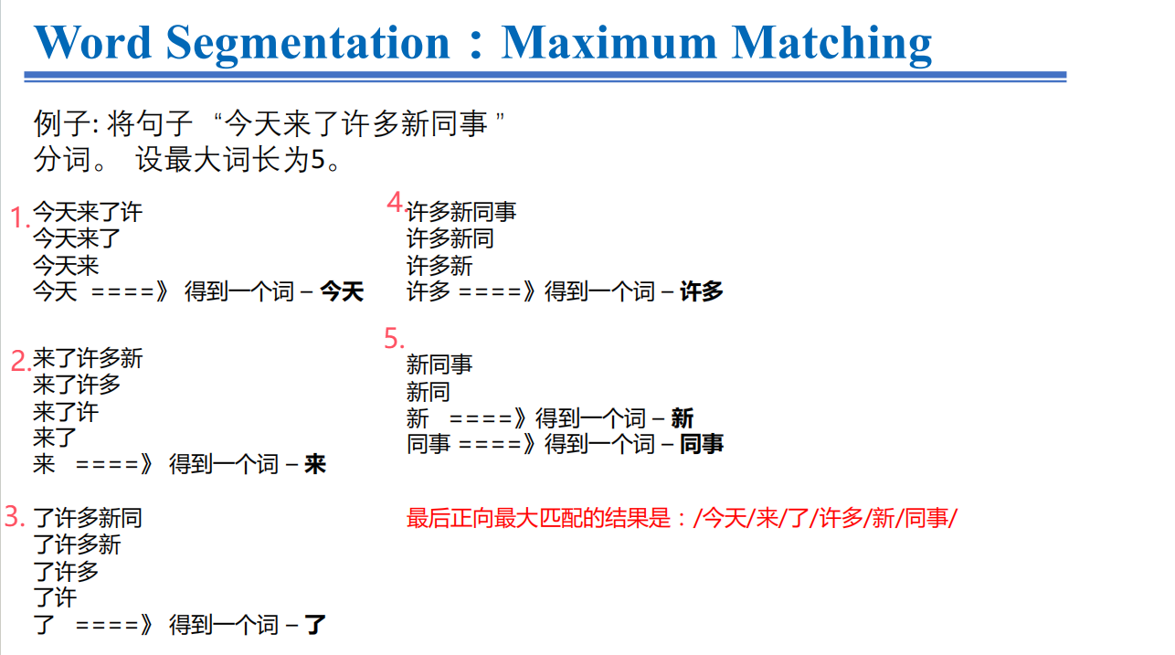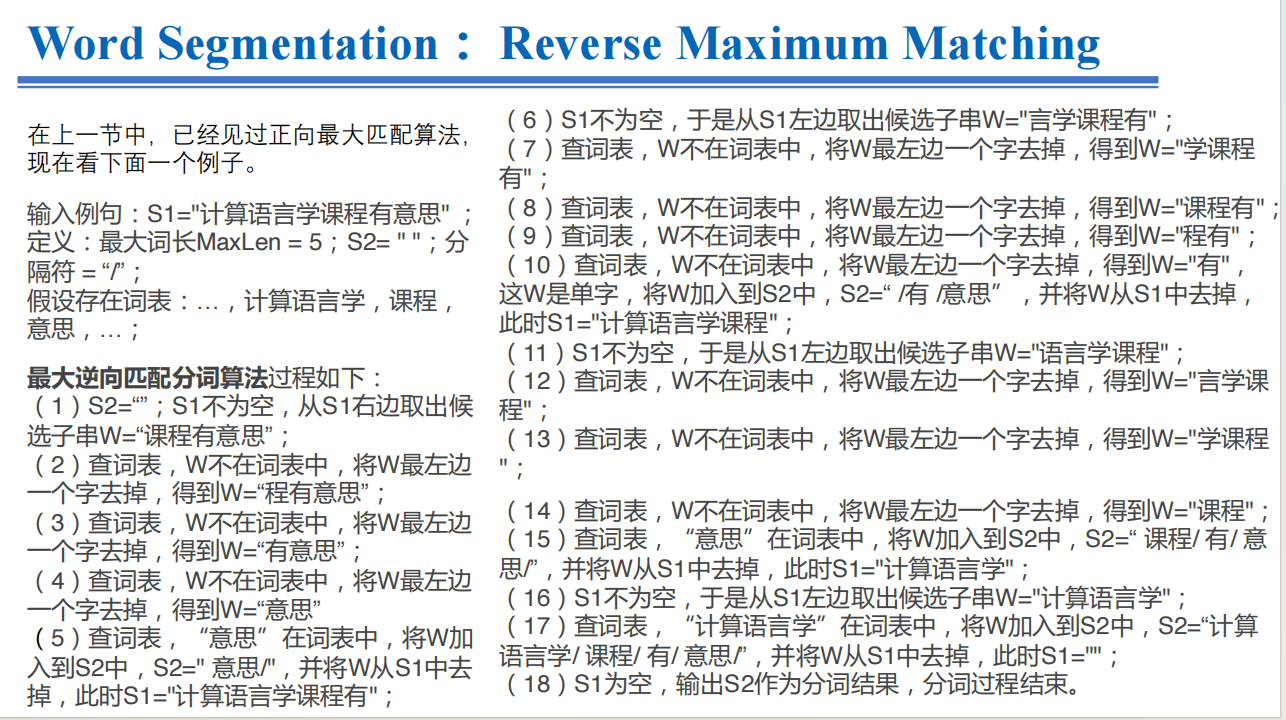 - 逆向最大匹配法(由右向左的方向)