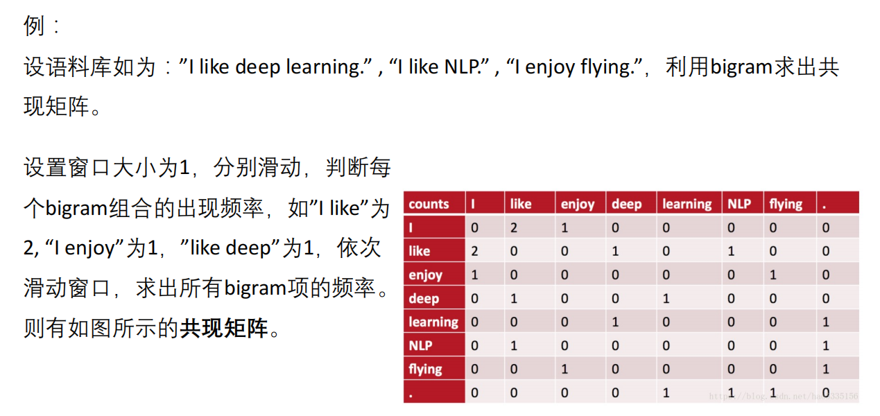 共现矩阵是基于N-Gram思想的又一种模型,其统计了一个词与其他词共同出现的频率,以此来建模词的特征。